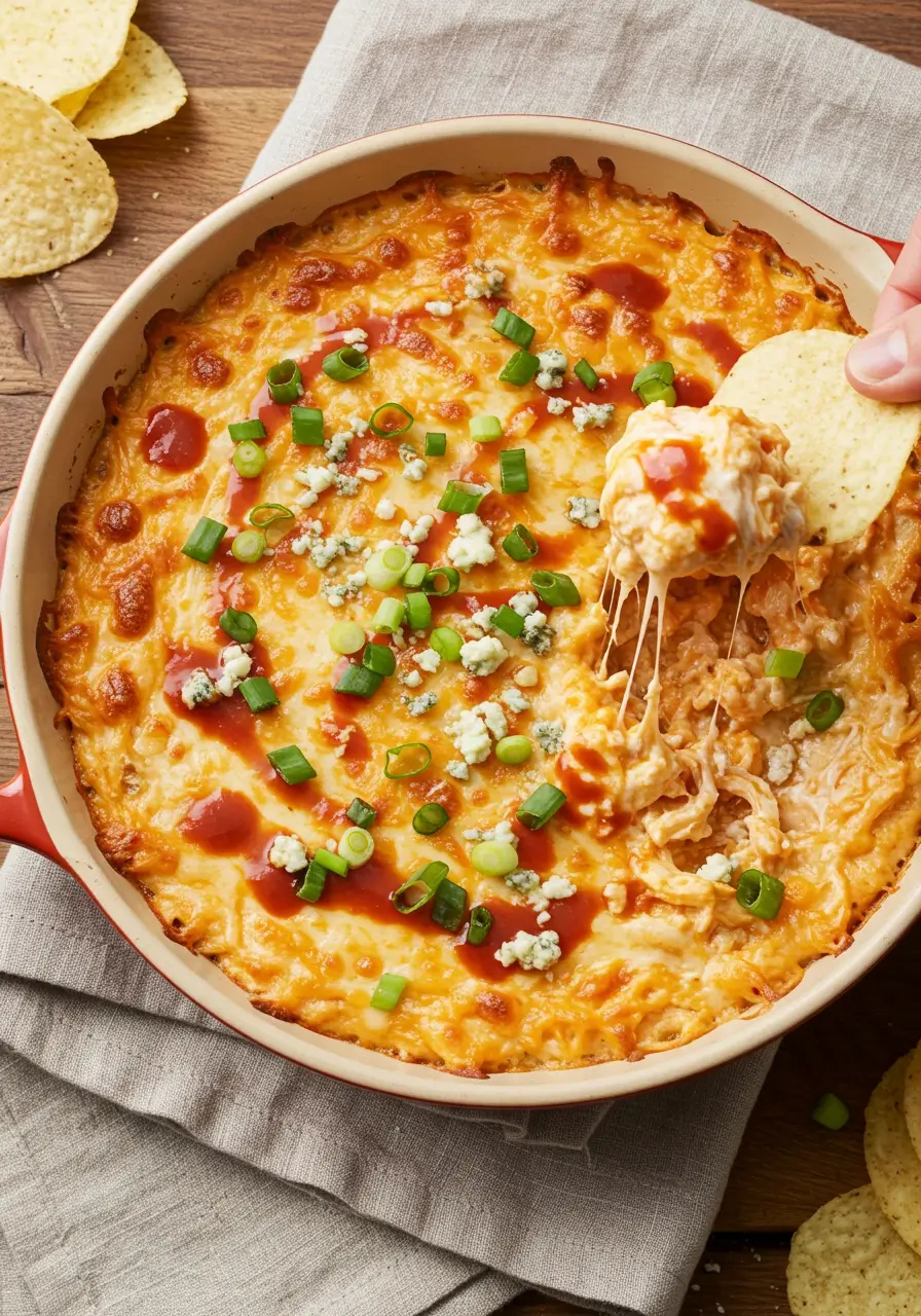 Serve the dip warm with celery sticks, crackers, or tortilla chips. For an elevated presentation, garnish with chopped green onions or a drizzle of additional Buffalo sauce.