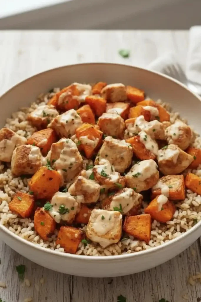 This Healthy Chicken & Sweet Potato Rice Bowl is not just tasty; it’s also packed with nutrients. The combination of lean protein from the chicken, vitamins from sweet potatoes, and fiber from rice makes it a great choice for any meal. Additionally, it’s easy to prepare and customizable to fit your taste preferences