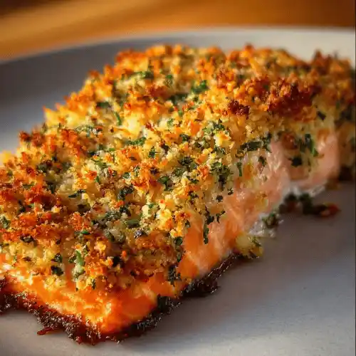 - Bake for 12–15 minutes, or until the salmon is cooked through and the topping is golden brown and crispy.