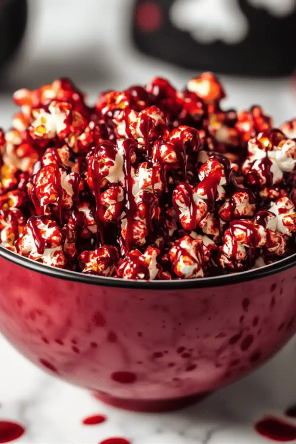 - Drizzle the red syrup over the coated popcorn to create a bloody effect.