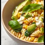 - In a large bowl, combine the cooked pasta, corn, cherry tomatoes, red onion, cilantro, avocado, and feta cheese.