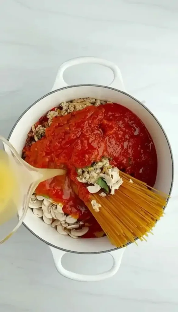 - Stir in spaghetti, vegetable broth, and diced tomatoes.