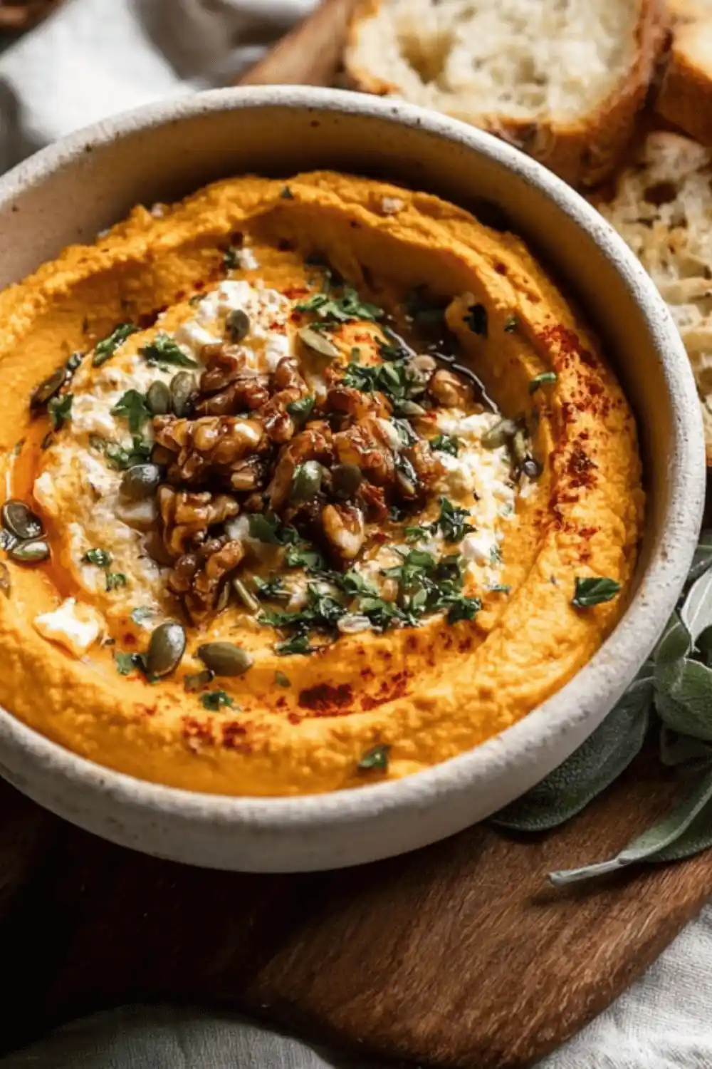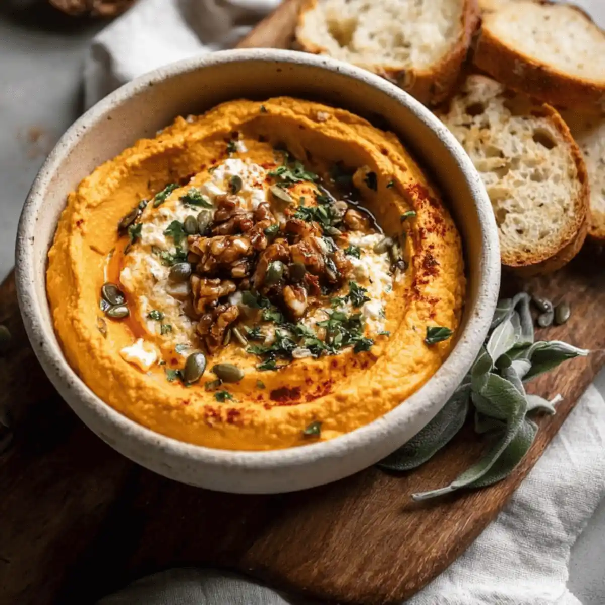 Serve Pumpkin Whipped Feta Dip in a nice bowl with a spread of toasted bread, like sourdough or a crunchy baguette, and a selection of crackers around it. This way, everyone can pick a dipping option they enjoy. You can also add colorful veggies for a healthier choice.