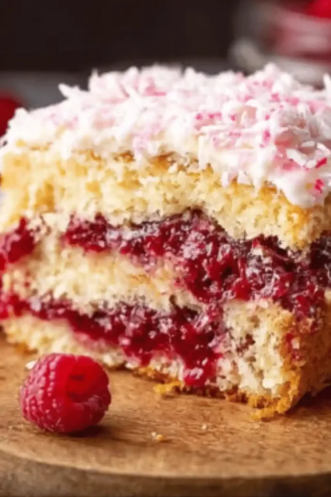 Raspberry Zinger Cake is a show-stopping dessert that combines rich tastes and beautiful presentation. The soft cake is moist and tender, while the raspberry filling adds a refreshing burst of flavor. The marshmallow frosting brings extra sweetness, and the shredded coconut gives it a beautiful finish.