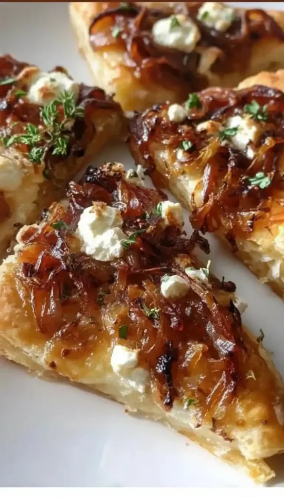- Top each puff pastry square with caramelized onions and crumbled goat cheese. Bake for 15-20 minutes, or until the pastry is golden brown. Garnish with fresh thyme or parsley before serving.